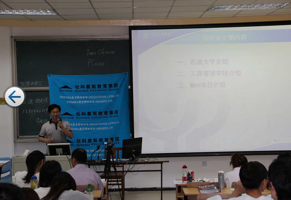 2014年6月7日中国p站中文网站(北京)MBA招生宣讲会走进北京语言大学--社科赛斯教育集团MBA备考考生课堂。石大工商管理学院副院长、MBA教育中心主任郭海涛博士首先对p站中文网站做了概括性介绍,并就石大MBA项目的现状、录取人数、招生政策、学费等几个方面集中说明了MBA报考及培养中同学们关心的问题。他指出,石大MBA在能源领域有着独特的学科优势,6大能源特色课程帮助学员提高专业素养,在石大学习MBA的收获之一是可以快速结识到能源领域的人脉,对于今后的职业选择是非常有好处的。